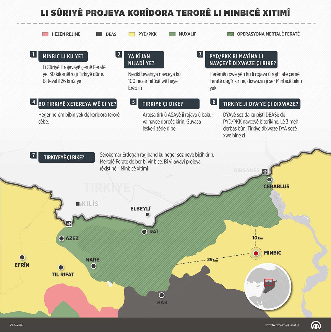 Navçeya Munbîçê ku dikeve aliyê bakûrê Sûriyeyê ji bo projeya korîdora terorê ya ku wê xeta sînor a PKK/PYDya rêxistina terorê bikeve navê girîng e. Ji aliyekê ve Tirkiye ji bo pêşîlêgirtina korîdora terorê zorê dide DYA û rêxistinê ji aliyê din ve jî terorîst ji bo projeyê bikine rewacê ji navçeyê venakişin.24 Mijdar 2016•Rojanekirin: 24 Mijdar 2016