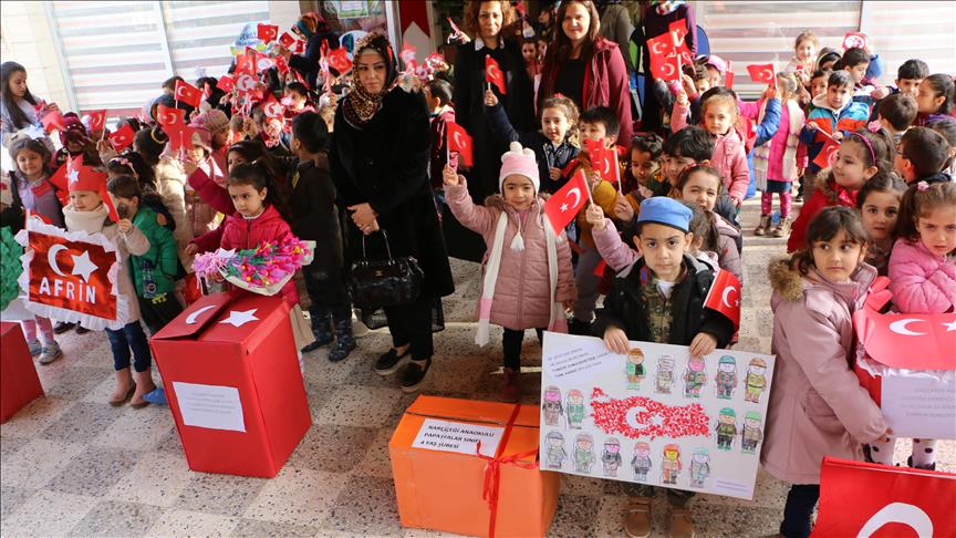 Li Şanliurfayê xwendekarên pêşdibistanê ji bo eskerên ku di operasyon Çiqlê Zeytûnê de wezîfedar in kum, gore û şalgerdan şandin.