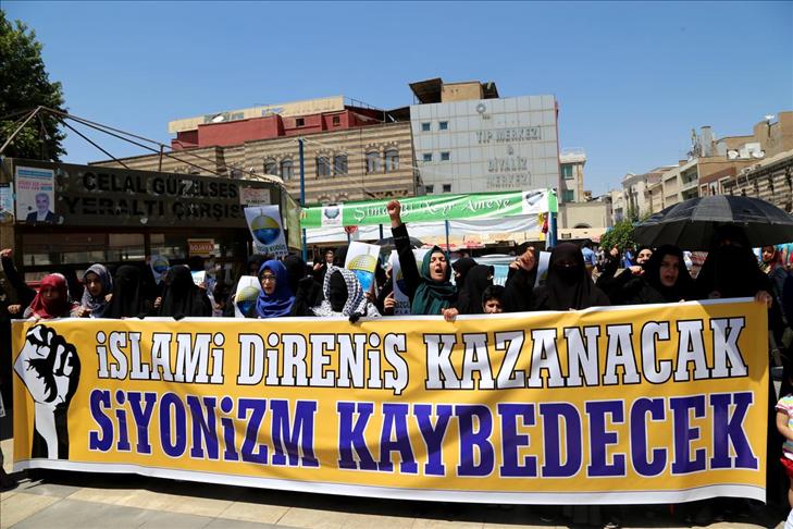 Kesên di komê de dowîzên ku li serê bi kurdî û tirkî "Qudsa Azad û dinyayeke bê Îsraîl", "Têkoşîna azadiya Qudsê têkoşîna azadiyê ya umetê ye" û "Em li gel gelê Filistînê ne" dinivîsand rakirin.