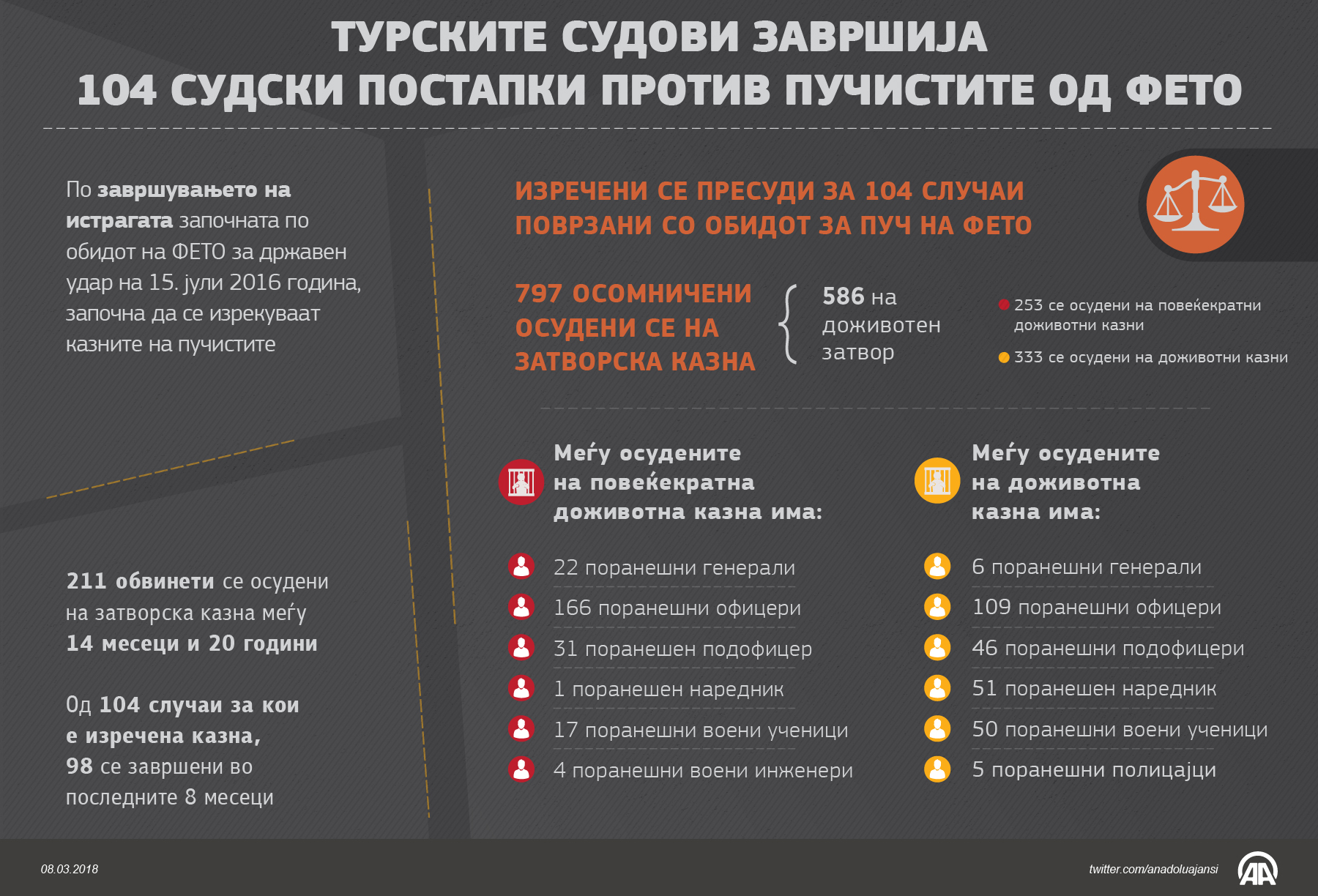 АНКАРА (АА) - Судовите во Турција досега завршија 104 судски постапки против терористичката организација ФЕТО, која се суди за обидот за воен удар, и изрекоа затворски казни за вкупно 797 обвинети, вклучувајќи и доживотни затворски казни за 586 обвинети08 Март 2018•Ажурирај: 08 Март 2018