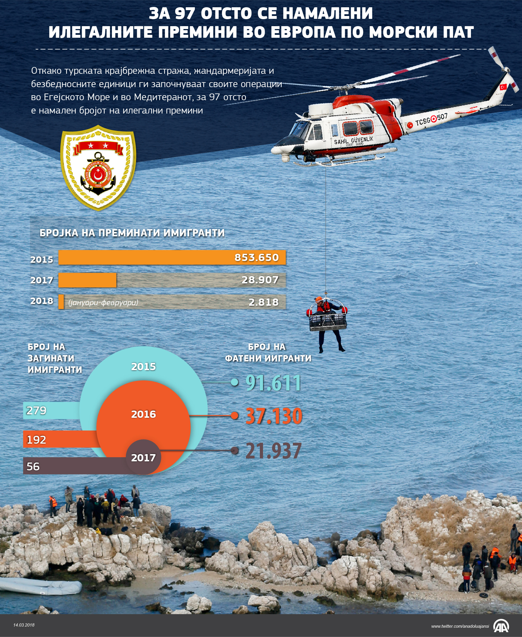 Додека 2015 претставува година во која беше достигнат врвот на илегалните премини на имигрантите кои по морски пат се обидуваа да пристигнат во Европа, по започнувањето на активностите на Командата на турската крајбрежна стража и другите единици оваа бројка е намалена за 97 отсто14 Март 2018•Ажурирај: 14 Март 2018