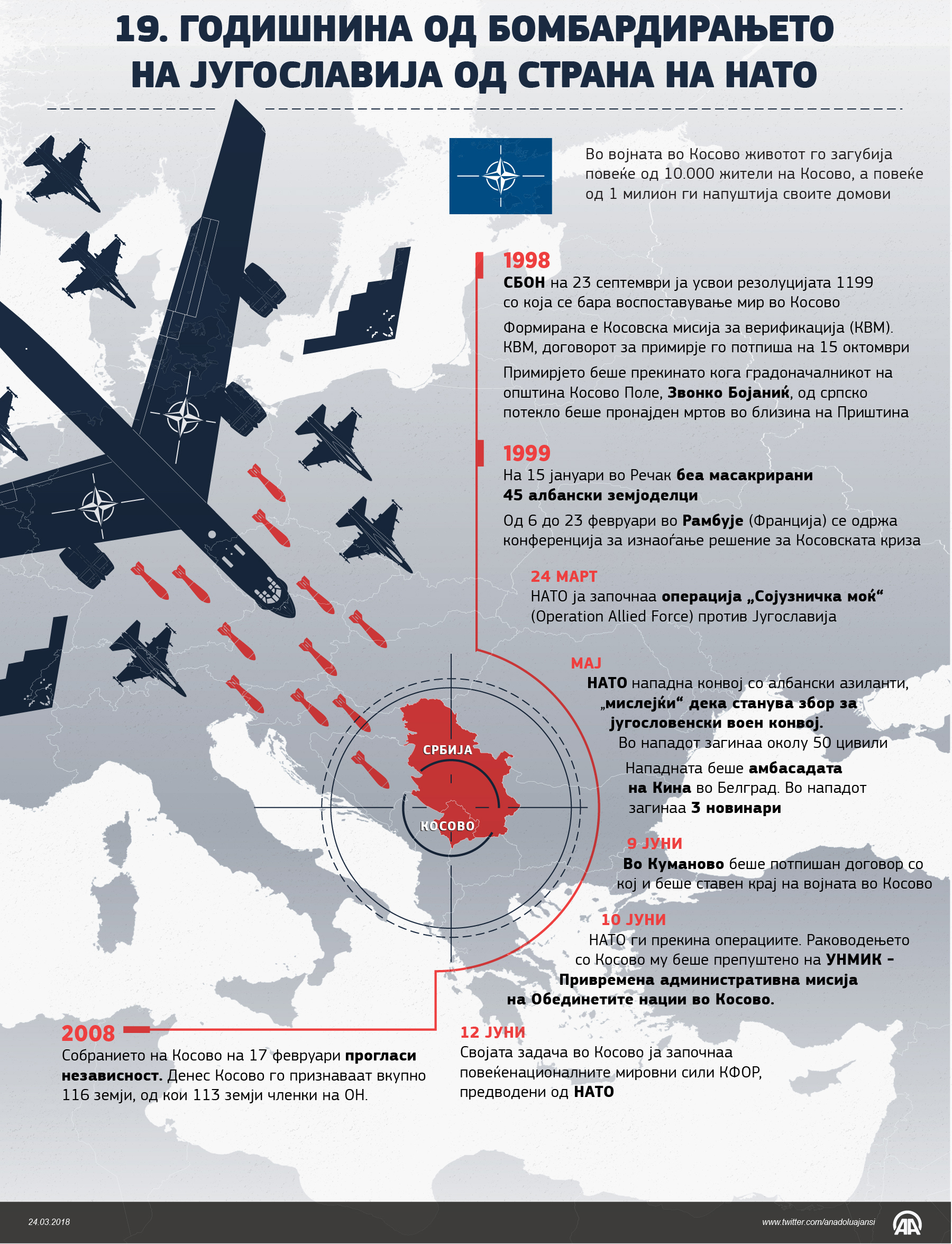 Со цел да се стави крај на притисоците и масакрите врз Албанците, на денешен ден пред 19 години НАТО ја започна операцијата „Сојузничка сила“ чија цел беше повлекување на Србите од земјата, стационирање на медијаторите, и враќање на бегалците во земјата24 Март 2018•Ажурирај: 24 Март 2018