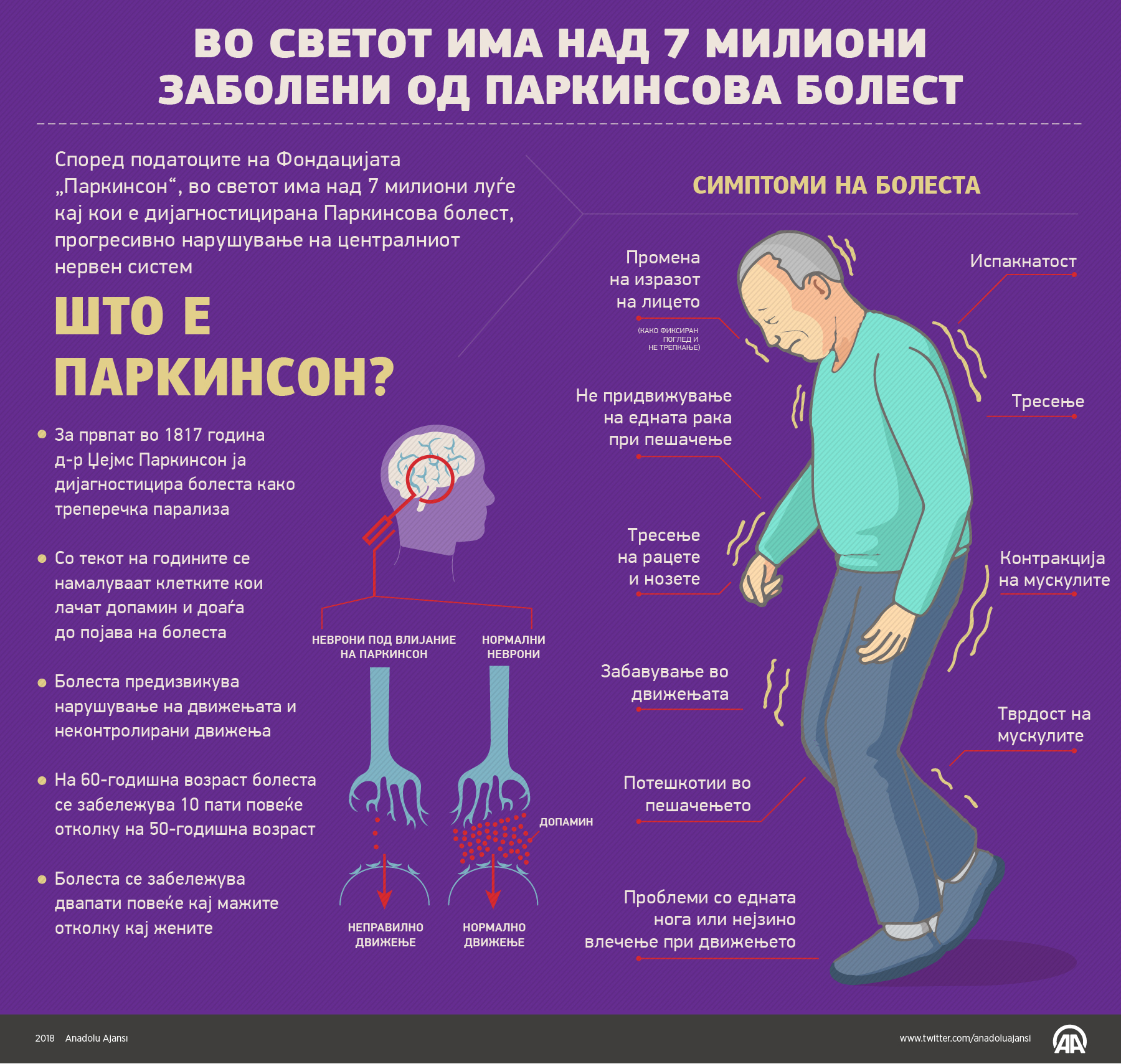 Паркинсовата болест претставува нарушување на движењата до кои доаѓа поради загубата на неврони кои лачат допамин, невротрансмитери во делот од мозокот кој ги контролира движењата10 Април 2018•Ажурирај: 10 Април 2018