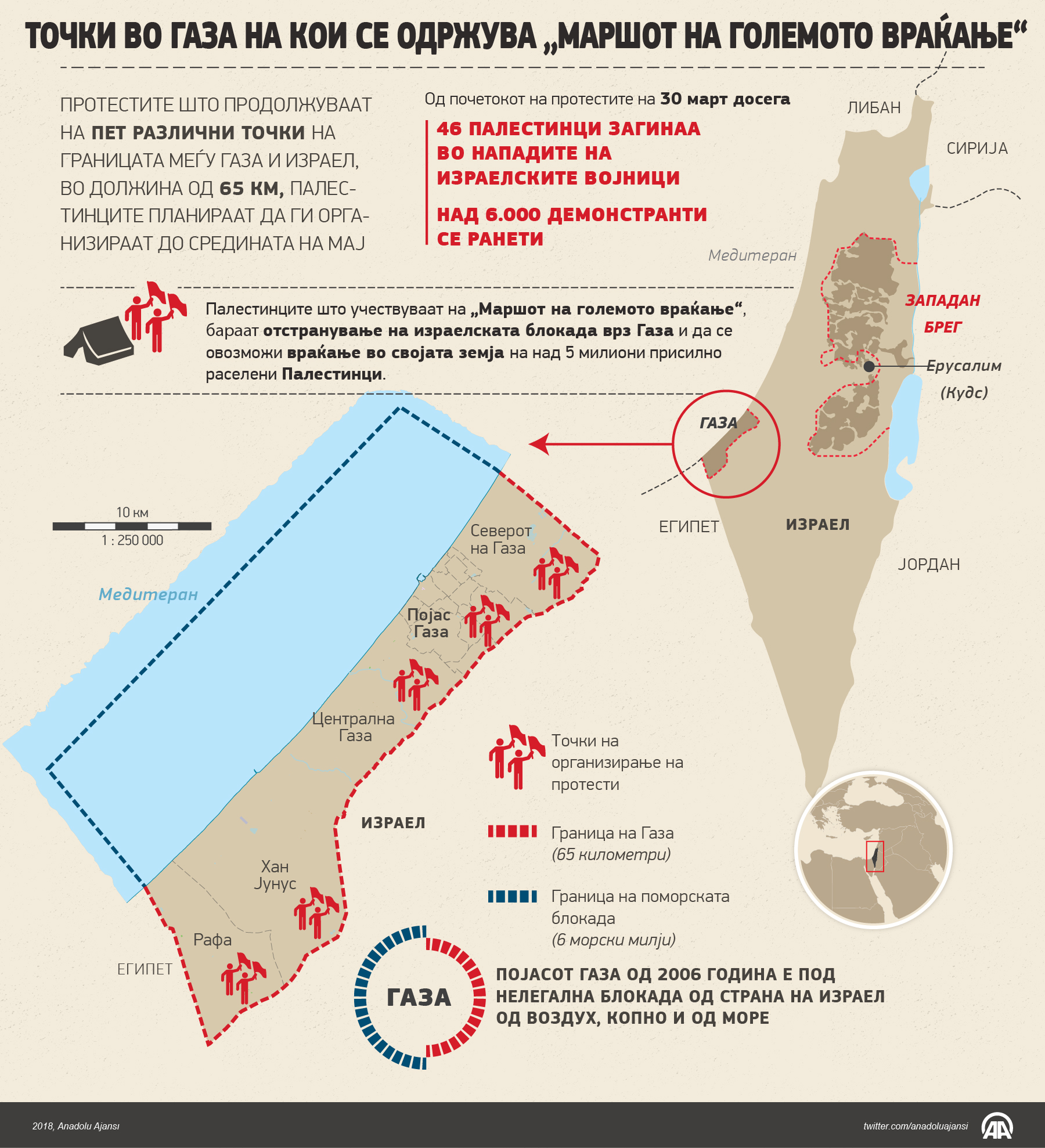 Десетици илјади Палестинци од 30 март организираат мировни протести на пет точки на границата меѓу Појасот Газа и Израел, со цел отстранување на нелегитимната блокада врз Појасот Газа и овозможување враќање на 5 милиони палестински бегалци кои беа протерани од својата земја29 Април 2018•Ажурирај: 29 Април 2018