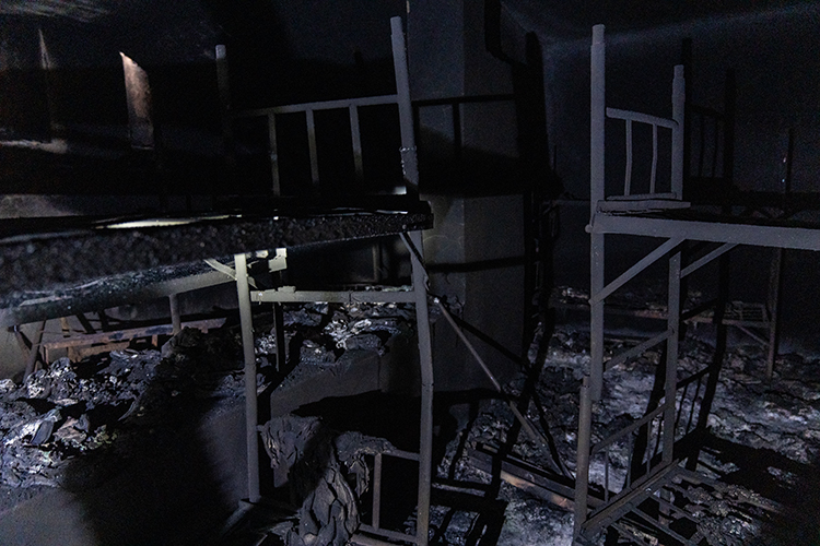 Группа вошла через обгоревшую дверь, выходящую во внешний двор на юго-востоке «белого здания» тюремного комплекса, спустилась по трем-четырем ступеням лестницы и, повернувшись направо, увидела, что три камеры в комнате, изображенной на рисунках, демонтированы. Эта зона была превращена в подобие помещения, внутренняя отделка и двухъярусные койки которой обгорели.