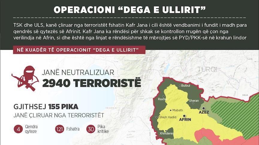 Që nga fillimi i operacionit, TSK dhe ULS kanë çliruar nga organizatat terroriste YPG/PKK-DEASH 155 pika, përfshirë katër qendra të qytezave, 121 fshatra, si dhe 30 pika kritike në Afrin.