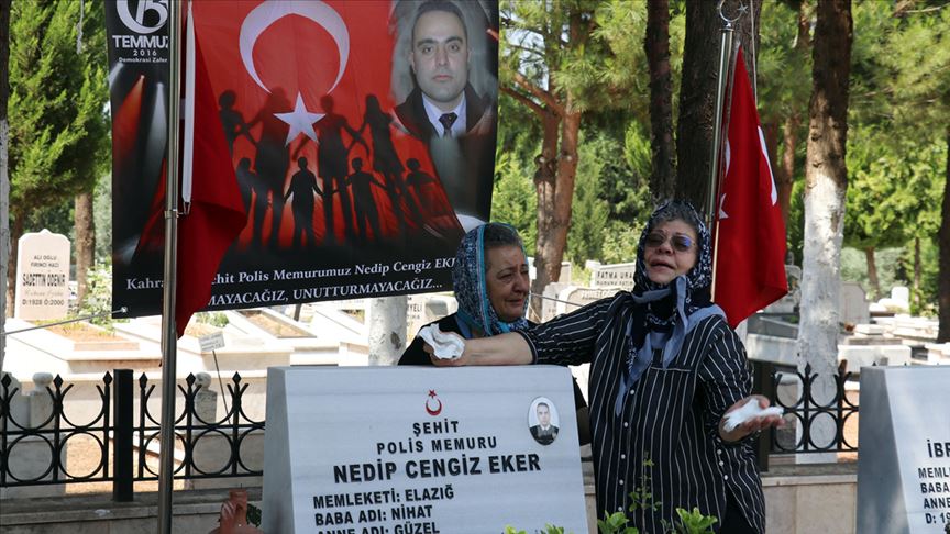 Muğla'nın Marmaris ilçesinde, Fetullahçı Terör Örgütü'nün (FETÖ) hain darbe girişimi sırasında Cumhurbaşkanı Recep Tayyip Erdoğan'ın kaldığı otele düzenlenen saldırıda şehit olan polis memuru Nedip Cengiz Eker'in annesi Güzel Eker de oğlunun mezarı başında gözyaşı döktü.