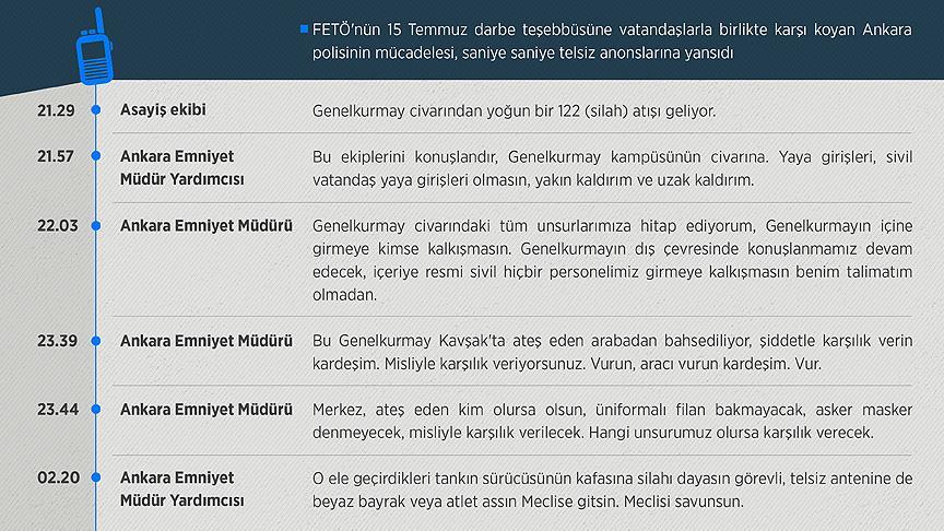 Bölgedeki bir asayiş ekibinin Genelkurmay'dan gelen silah seslerini duyması ile haberdar olunan Fetullahçı Terör Örgütü'nün (FETÖ) darbe girişimine karşı Ankara Emniyet Müdürlüğü ekiplerince başlatılan mücadele, saniye saniye telsiz anonslarına yansıdı.