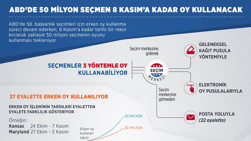ABD'de 58. başkanlık seçimi için erken oy kullanma süreci devam ederken 8 Kasım'a kadar yaklaşık 50 milyonla rekor sayıda seçmenin oy kullanması bekleniyor.