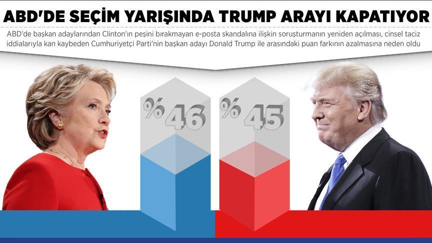 Demokrat Parti'nin başkan adayı Clinton'ın peşini bırakmayan e-posta skandalına ilişkin soruşturmanın yeniden açılması, rakibi Trump ile arasındaki puan farkının azalmasına neden oldu.