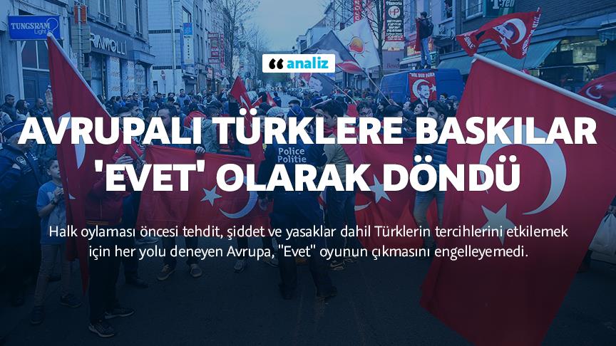 Cumhurbaşkanlığı hükümet sistemini öngören Anayasa değişikliği için yapılan halk oylamasında Avrupalı Türklerin sandıkta verdiği karar, Almanya ve Hollanda başta olmak üzere birçok Avrupa ülkesinin baskı ve tehditlerinin, vatandaşların tercihlerinde ters etkiye neden olduğunu gösterdi.