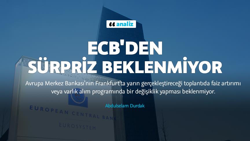 Avrupa Merkez Bankası'nın (ECB), son dönemde artan enflasyon ve olumlu ekonomik göstergelere karşın yarın yapacağı toplantıda faiz artırımı veya aylık 60 milyar avroluk varlık alım programında bir değişiklik yapması beklenmiyor.