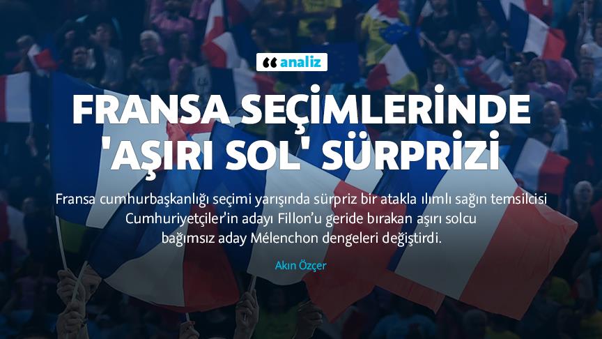 Bu iki isim daha iki hafta öncesine kadar yüzde 25 dolayındaki oy oranlarıyla 7 Mayıs’taki ikinci tura kalacak banko adaylar olarak görülüyordu. Ama son haftalarda sürpriz bir atakla seçmen desteğini yüzde 20’ye çıkararak yüzde 19 desteğe sahip görünen ılımlı sağın temsilcisi Cumhuriyetçiler'in (LR/Les Républicains) adayı François Fillon’u geride bırakan aşırı solcu bağımsız aday Jean Luc Mélenchon bu denklemi bozmuş görünüyor.
