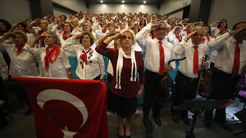 Kırmızı beyaz kıyafetleriyle "Mehmetçik'in yanındayız" mesajı veren koro üyeleri, söyledikleri marşın ardından "asker selamı" verdi.