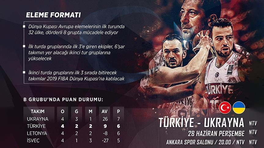 A Milli Erkek Basketbol Takımının Ukrayna ile yapacağı maç saat 20.00'de başlayacak ve NTV'den canlı yayınlanacak.