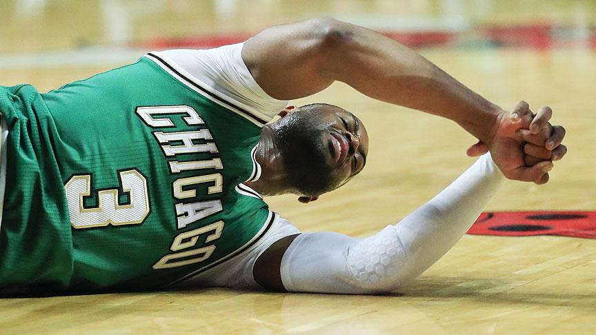 Kulüpten yapılan açıklamaya göre, Bulls'un Memphis Grizzlies'e 98-91 yenildiği maçta Zach Randolph'a çarpışması sonucu sakatlanan Wade'in sağ dirseğinde, burkulmanın yanı sıra ufak da bir kırık tespit edildi.