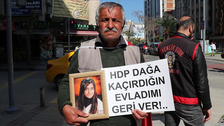 Terör örgütü PKK tarafından dağa kaçırılan kızına kavuşabilmek adına Diyarbakır HDP İl Başkanlığı önünde başladığı oturma eylemini sağlık nedenleriyle partinin İzmir İl Başkanlığı önünde sürdüren Mehmet Laçin, AA muhabirine açıklama yapan Laçin, lise öğrencisi kızı Gamze Laçin'in 2011'de dağa kaçırıldığını söyledi.