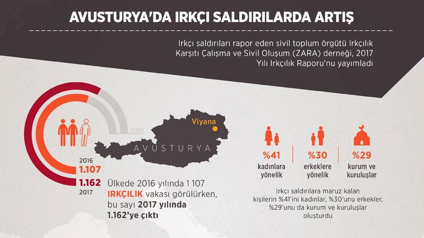 Buna göre, Avusturya'da ülkede 2016 yılında bin 107 ırkçılık vakası görülürken bu sayı 2017 yılında bin 162'ye çıktı.