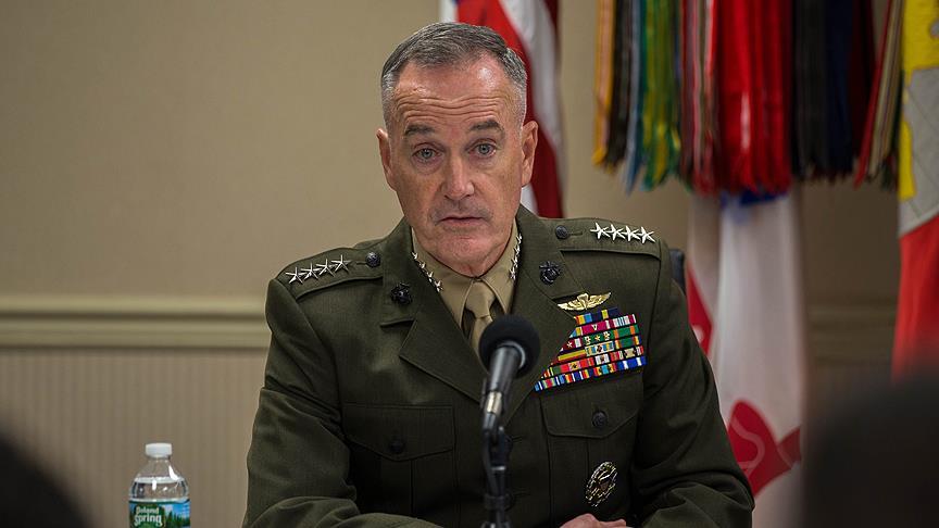 Dunford, ABD'nin DEAŞ'la Mücadele Özel Temsilcisi Brett McGurk ile Virginia eyaletindeki Fort Belvoir Askeri Üssü'nde ev sahipliğini yaptığı "Şiddet Yanlısı Aşırı Örgütlerle Mücadele Genelkurmay Başkanları Konferansı"nın ardından düzenlediği basın toplantısında gazetecilerin sorularını yanıtladı.
