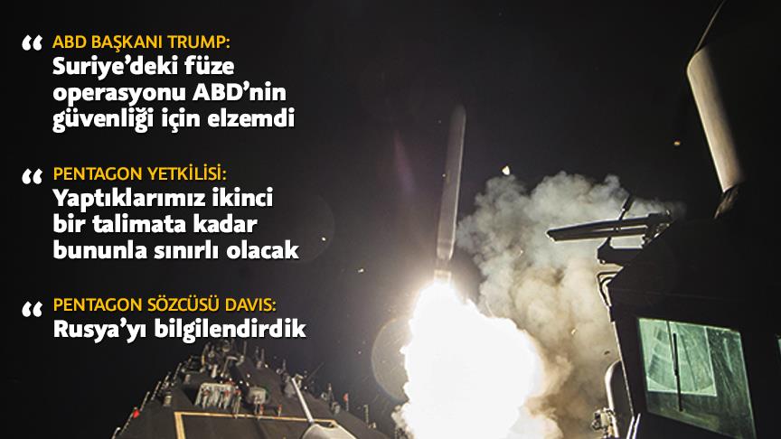 ABD Savunma Bakanlığında (Pentagon) gazetecilere açıklama yapan Albay Jeff Davis, "Başkan'ın (Donald Trump) talimatıyla ABD kuvvetleri, Suriye Hava Kuvvetlerine ait bir üssü yerel saatle 4.45, ABD Doğu Yakası yerel saatiyle 8.45’te seyir füzeleri ile vurdu." açıklamasını yaptı.
