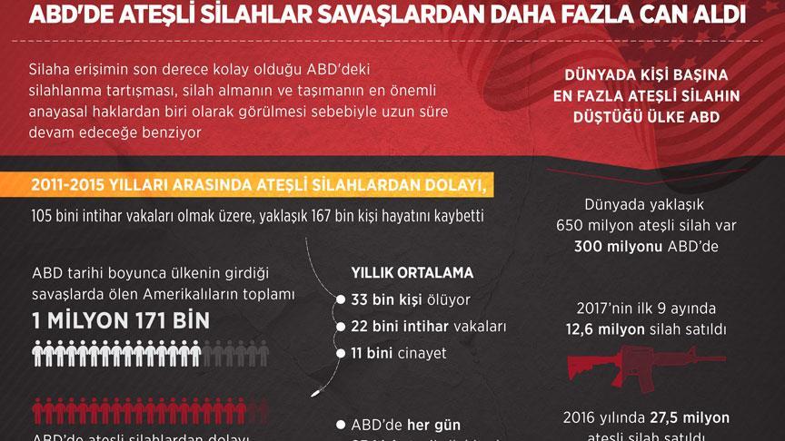 Aynı merkezlerin yıllık raporlarına göre, ABD'de 1968-1980 yılları arasında 377 bin, 1981-1998 yılları arasında 620 bin, 1999-2010 yılları arasında 364 bin, 2011-2015 yılları arasında da 167 bin kişi, ateşli silahlar sonucunda hayatını kaybetti.