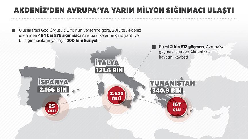 IOM'ye göre, yıl başından beri Avrupa'da denizyoluyla en fazla sığınmacı Yunanistan'a gitti. Yunanistan'a bu yıl 340 bin 991 sığınmacı giriş yaptı. Bunların yaklaşık 176 binini Akdeniz üzerinden giden Suriyeliler oluşturdu. İtalya'ya ise Akdeniz'i geçerek 121 bin 619 sığınmacı ulaştı. İspanya'ya 2 bin 166, Malta'ya 100 sığınmacı gitti.