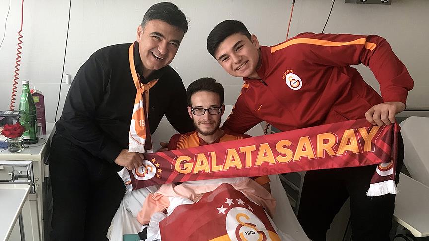 Almanya’nın Gelsenkirchen kentinde Galatasaray'ın şampiyonluk kutlamaları esnasında polisin köpekli saldırısına uğrayan Tufan Çolak'ı hastanede ziyaret eden Avrupa Galatasaray Dernekleri Federasyonu Başkanı Yakup Peker, Çolak'a Galatasaray forması, kaşkolu ve bayrağı hediye etti.