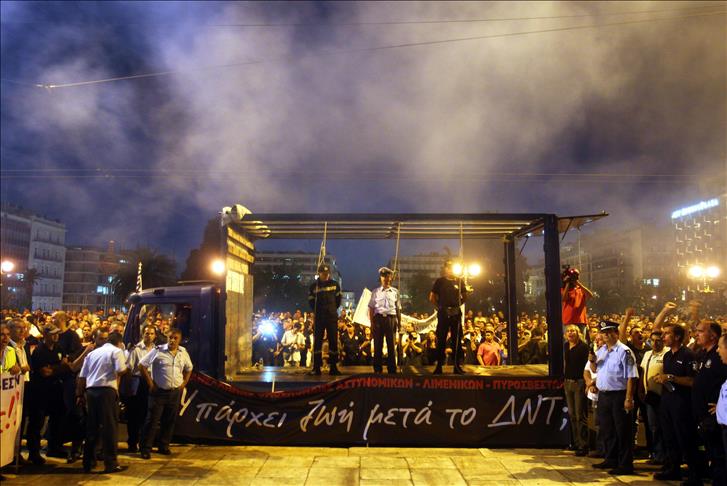 Yunanistan'da AB, Avrupa Merkez Bankası ve IMF tarafından istenen toplam 11,5 milyar avroluk yeni harcama kesintileri çerçevesinde, maaş ve sosyal haklarında yapılacak kesintileri protesto eden polis, sahil güvenlik ve itfaiye çalışanları, Sintagma Meydanı'nda sembolik olarak kurdukları dar ağacına çıktı.