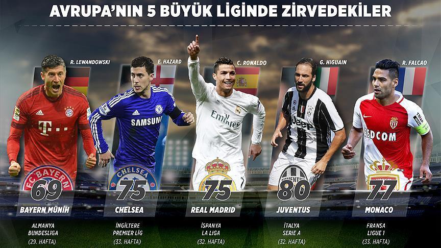 İngiltere'de Chelsea, İspanya'da Real Madrid, Almanya'da Bayern Münih, İtalya'da Juventus ve Fransa'da Monaco, zirvedeki yerlerini korudu.