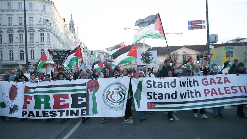 Viyana'daki İnsan Hakları Meydanı’nda toplanan göstericiler, "Hemen ateşkes", "Soykırıma hayır" ve "Terörist İsrail" yazılı pankartlar açtı.