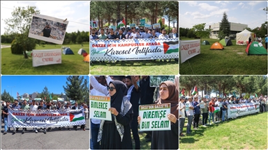 Eylemciler, üzerinde “Soykırımı durdurun”, “Filistin’e özgürlük”, "Gazze ağlama senin ölmene asla izin vermeyeceğiz” ve “Almanya senin elinde kan var” yazılı dövizler taşıdı.