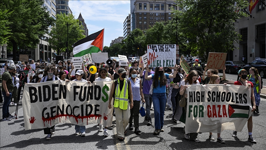 Filistinli öğrencilerin yanı sıra Amerikalı öğrencilerin de bulunduğu yaklaşık 100 kişiden oluşan grup, İsrail ile ABD yönetimlerine sert şekilde tepkilerini dile getirirken, Demokrat Joe Biden yönetiminin İsrail'e silah göndermeyi durdurması çağrısında bulundu.