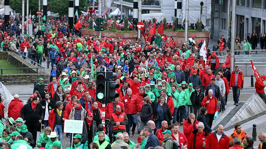Brüksel şehir merkezindeki Kuzey Tren İstasyonu'nda sendikaların çağrısıyla toplanan yaklaşık 60 bin kişi, merkez sağ hükümetin haftalık çalışma saatlerini 38'den 45'e çıkarmaya yönelik düzenlemesine ve emeklilik yaşının 65'den