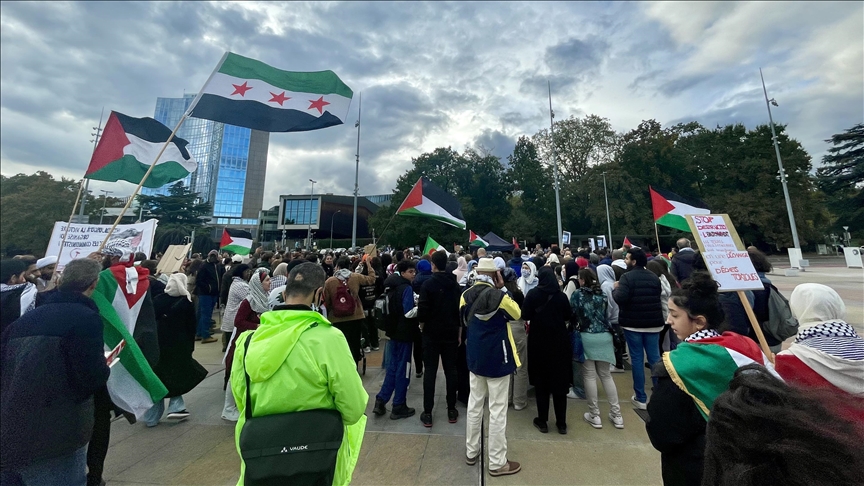 Tunus İşkence Mağdurları Derneği (AVTT) öncülüğünde Birleşmiş Milletler (BM) Cenevre Ofisi önünde, sivillere yönelik silahlı şiddete karşı mücadeleyi simgeleyen kırık sandalye heykelinin bulunduğu meydanda düzenlenen gösteriye yüzlerce kişi katıldı.