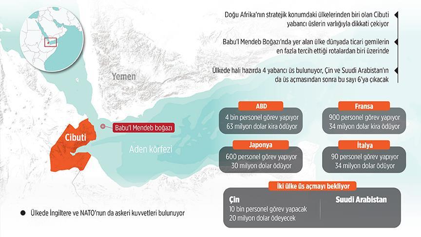 Akdeniz ile Hint Okyanusu'nu birbirine bağlayan Kızıldeniz-Aden Körfezi hattının geçiş noktası Babu'l Mendeb Boğazı'nda yer alan Cibuti'de hali hazırda Fransa, ABD, İtalya ve Japonya'nın askeri üssü bulunurken, Çin ve Suudi Arabistan da yakında Doğu Afrika ülkesinde üs açmayı planlıyor.