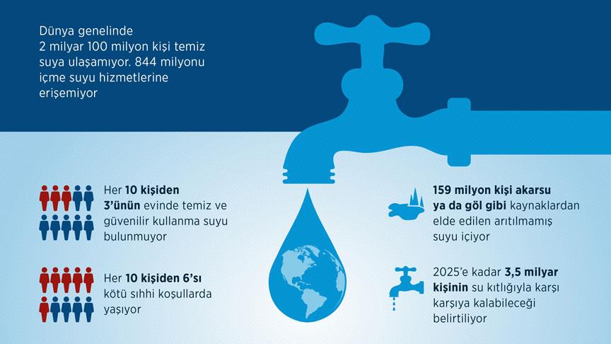 Raporda, temiz ve güvenilir su kaynaklarından yoksun 2,1 milyar kişinin bulunduğu ve bunlardan 844 milyonunun içme suyuna erişemediği kaydedildi.