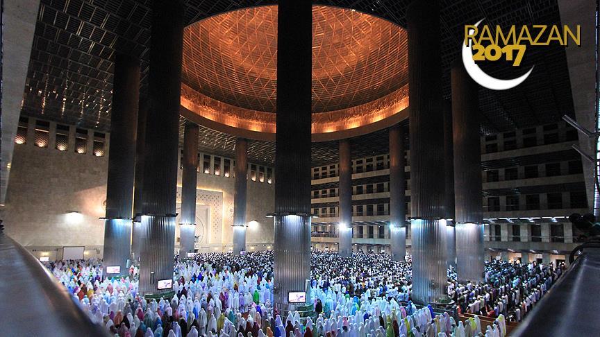 Endonezya’nın başkenti Cakarta'da binlerce Müslüman, ramazan ayındaki önemli ibadetlerden sayılan teravihi eda etmek için Güneydoğu Asya'nın en büyük camisi olarak bilinen ve başkentin sembolleri arasında yer alan 120 bin kişi kapasiteli İstiklal Camisi'ne gitti.