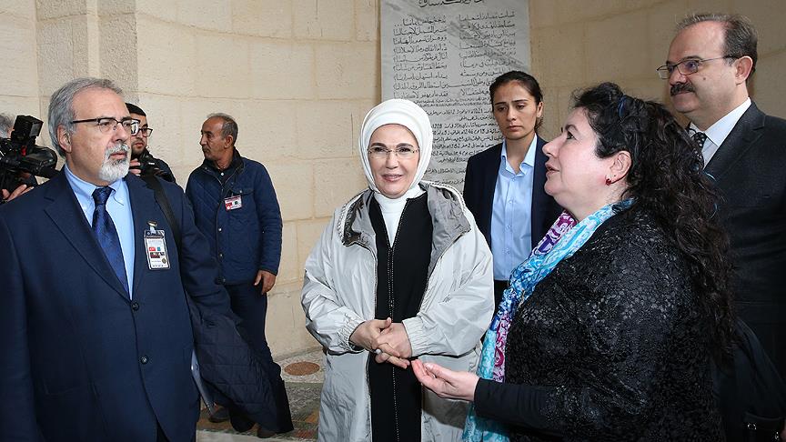 Kalabalık bir topluluğun bulunduğu meydanda sevgi gösterileriyle karşılanan Emine Erdoğan, cami ve TİKA tarafından burada yürütülen restorasyon çalışmaları hakkında bilgi aldı.