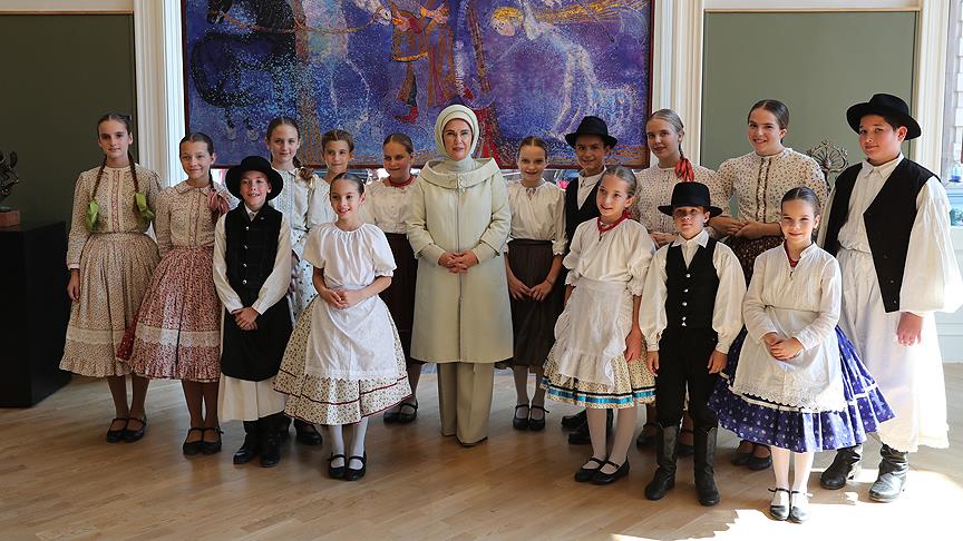 Macar Kültür Evi'nde çocuklar tarafından sahnelenen geleneksel dans gösterilerini izleyen Emine Erdoğan, ardından el sanatları atölyesini gezdi.