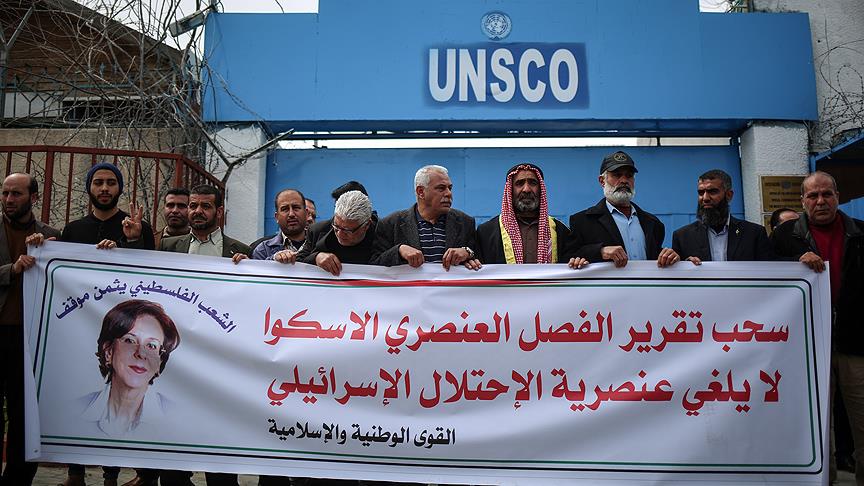 Birleşmiş Milletler Batı Asya Ekonomik ve Sosyal Komisyonu (ESCWA) tarafından hazırlanan İsrail'in ırkçı uygulamalarının ispatlandığı raporun geri çekilmesi, Batı Şeria'nın Ramallah kentinde protesto edildi.