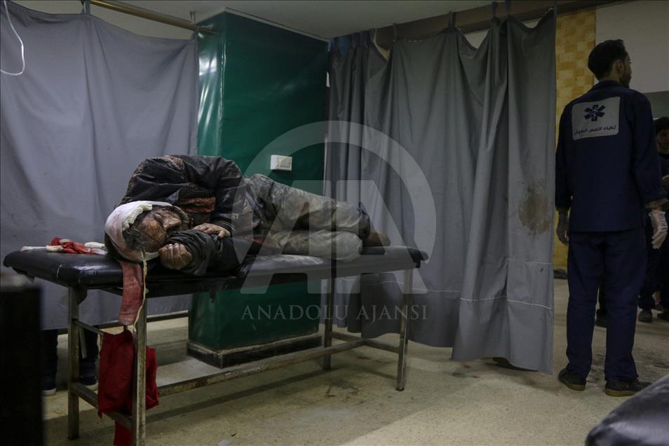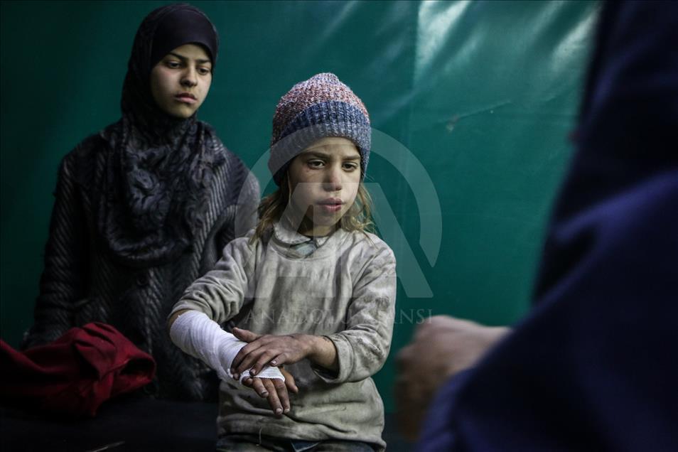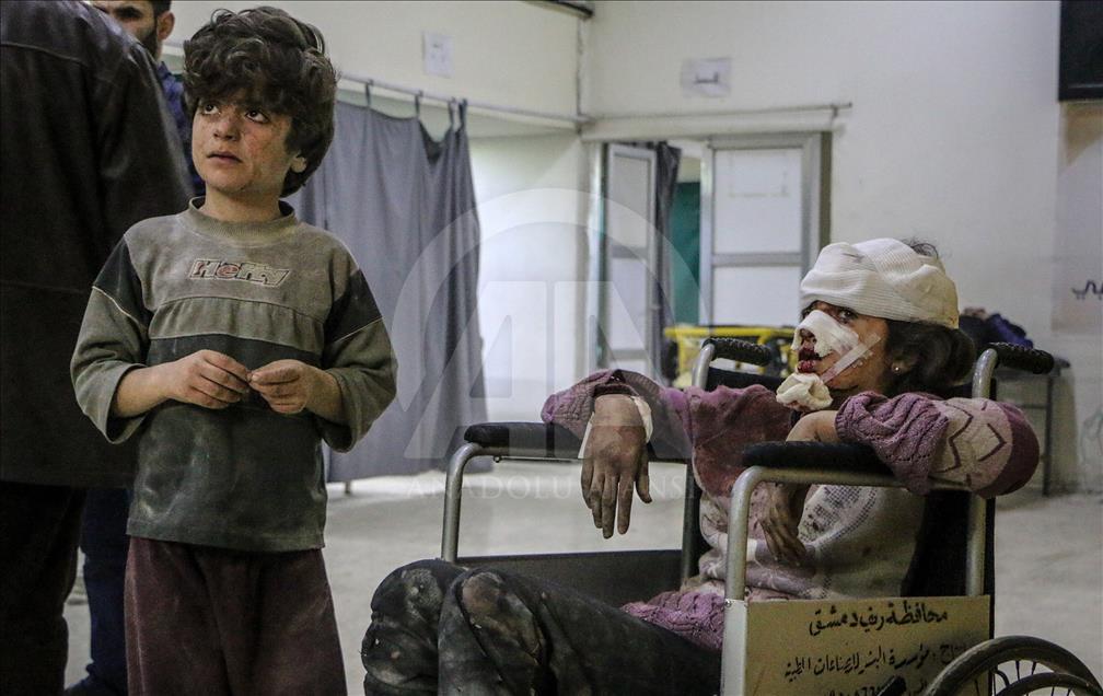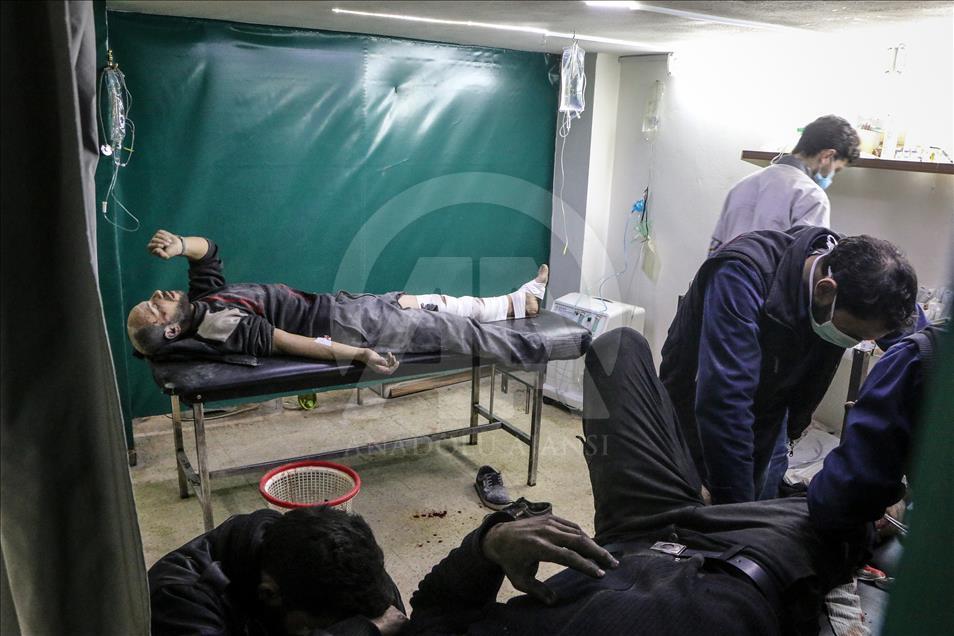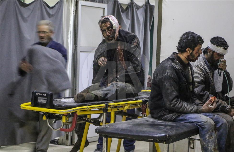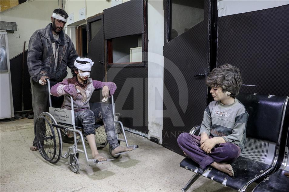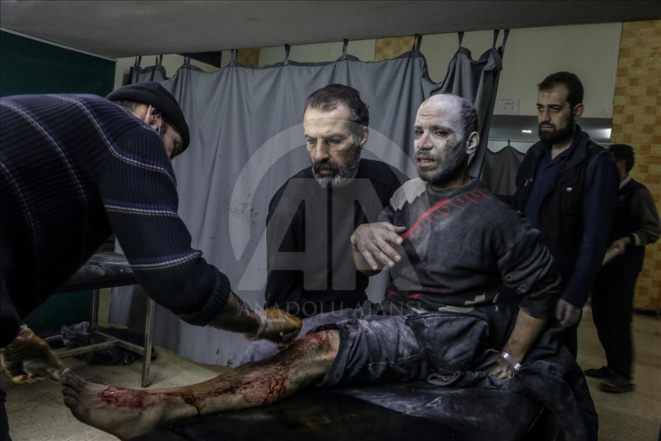Beşşar Esed rejimi ve destekçilerinin, Birleşmiş Milletler Güvenlik Konseyinin (BMGK) kararı ve Rusya'nın ilan ettiği 5 saatlik ateşkese rağmen Doğu Guta'nın farklı yerleşimlerine düzenlediği saldırılarda 19 sivil yaşamını yitirdi. Doğu Guta'nın Zemelke bölgesine düzenlenen saldırılar sonucu yaralananlar, bölgedeki sahra hastanesine kaldırılarak tedavi altına alındı. ( Mohammed Al Shami - Anadolu Ajansı )