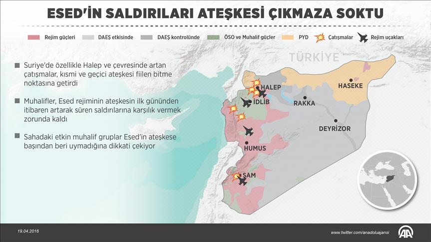 Suriye'de Beşşar Esed yönetiminin ateşkesi ısrarla ihlal eden tutumu, Cenevre'de diplomatik çabaların sekteye uğramasına ve sahada çatışmaların tekrar alevlenmesine neden oldu. Mevcut durumda ateşkes fiilen bitme noktasına gelirken, muhalifler artık rejime misilleme yerine doğrudan saldırmak zorunda kalacaklarının sinyalini veriyor.