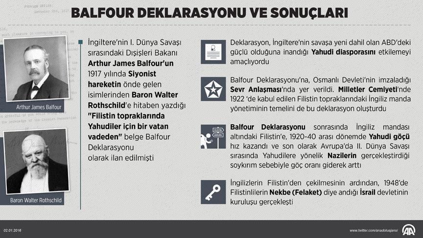 "Kudüs'ü Yahudileştirme çabası devam ediyor. Yerleşim alanlarına durmadan yenileri ekleniyor. Filistin'de günlük olarak işlenen tüm ihlaller Balfour Deklarasyonu'nun somutlaşmış halidir."
