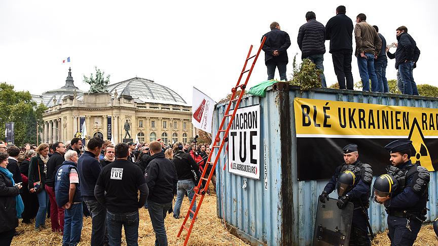 Fransa'da çiftçiler, Cumhurbaşkanı Emmanuel Macron'un tarım politikalarını protesto etmek için Şanzelize caddesinin bir bölümünü samanlarla kapattı.