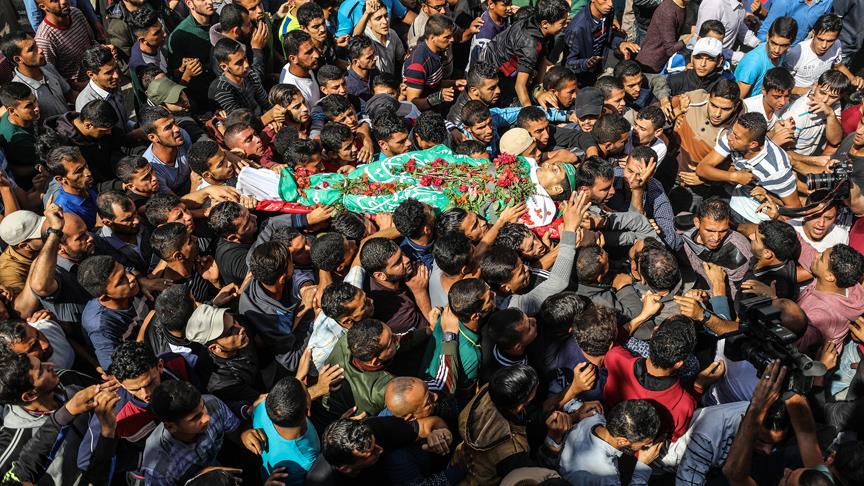İsrail askerlerinin abluka altındaki Gazze sınırında düzenlenen barışçıl "Büyük Dönüş Yürüyüşü" eylemlerine katılan göstericilere açtığı ateş sonucu şehit olan 4 Filistinli son yolculuğuna uğurlandı.