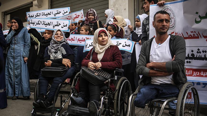 Gazze Şeridi'ndeki Dir el-Belh Engelliler Rehabilitasyon Merkezi önünde bir araya gelen onlarca engelli, "Onurlu bir hayat benim de hakkım" "Elektrik kesintisi ve jeneratörleri çalıştıracak yakıtın olmaması sebebiyle hizmetlerin durmasından dolayı özür diliyoruz" yazılı dövizler taşıdı.