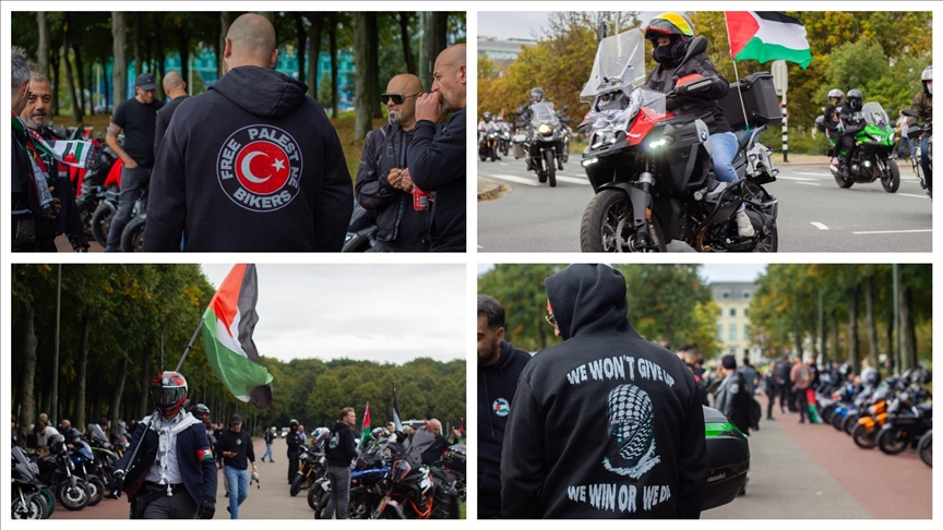 Anlık gelişmeler için AA Canlı Malieveld Meydanı'nda buluşan motosiklet sürücüleri kentin ana caddelerinde konvoy oluşturarak Filistin'e destek gösterisi yaptı.