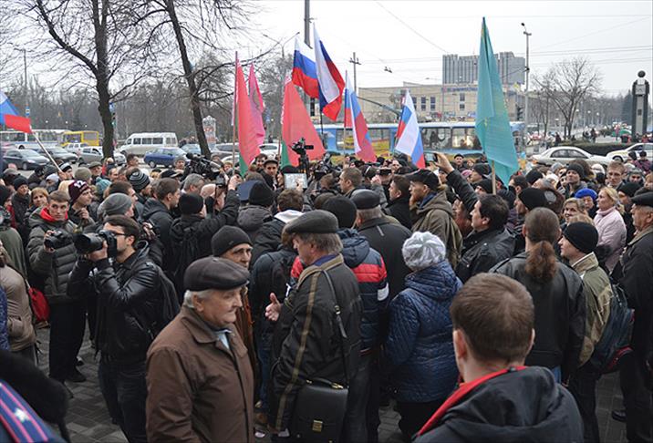 Yanukoviç'in memleketi Donetsk şehrindeki Baş Meydan'da Rusya yanlısı eylemcilerin gösterileri devam ederken, diğer tarafta Ukrayna bayraklarıyla toplanan eylemciler ise "Donetsk Ukrayna'nındır", "Dünyaya barış", sloganları atarak, ülkenin bölünmez bütünlüğünü desteklediklerini dile getirdi.