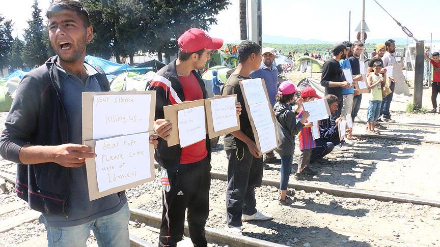 Aralarında çocukların da bulunduğu grup, "Papa, seni İdomeni'ye de bekliyoruz'' ve ''Bizi kurtarın ya da ölüme geri gönderin'' yazılı dövizler taşıdı.