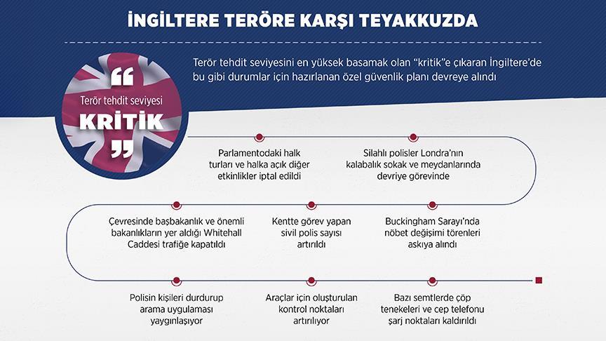 Manchester’daki konser salonunda düzenlenen terör saldırısının ardından iç istihbarat servisi MI5 bünyesinde, 2003'te kurulan ve 16 bakanlık ile kurumdan uzmanları bir araya getiren Ortak Terör Analiz Merkezi (JTAC), terör tehdit seviyesini "ciddi"den en yüksek düzey olan "kritik"e yükseltmişti.